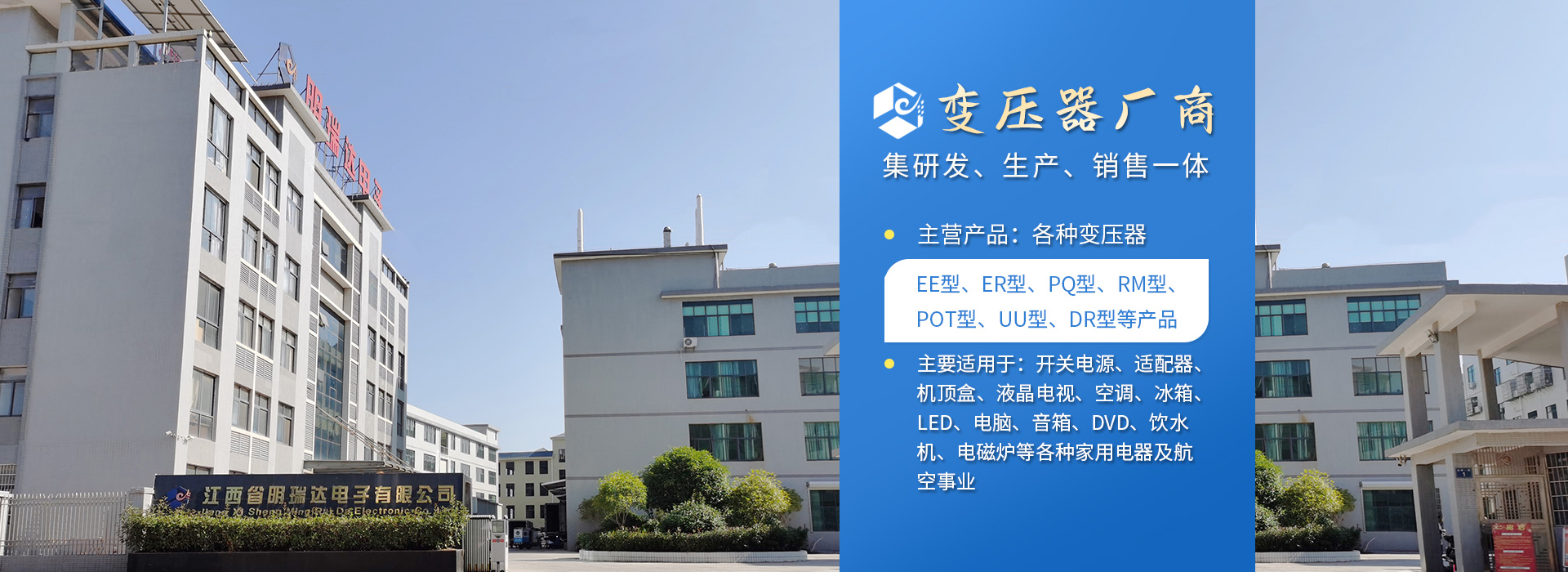 江西省明瑞達(dá)電子有限公司座落于江西省贛州市石城縣,是一家研發(fā)、生產(chǎn)、銷售各種變壓器廠商。生產(chǎn)銷售、技術(shù)服務(wù)、產(chǎn)品研發(fā)為一體的綜合性企業(yè),主要生產(chǎn)、銷售產(chǎn)品:變壓器(EE型、ER型、PQ型、RM型、POT型、UU型、DR型等產(chǎn)品),主要適用于:開關(guān)電源、適配器、機(jī)頂盒、液晶電視、空調(diào)、冰箱、LED、電腦、音箱、DVD、飲水機(jī)、電磁爐等各種家用電器及航空、醫(yī)療事業(yè)。